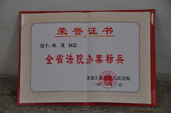 赵波同志被黑龙江省高级人民法院授予2011年度全省法院系统“办案标兵”