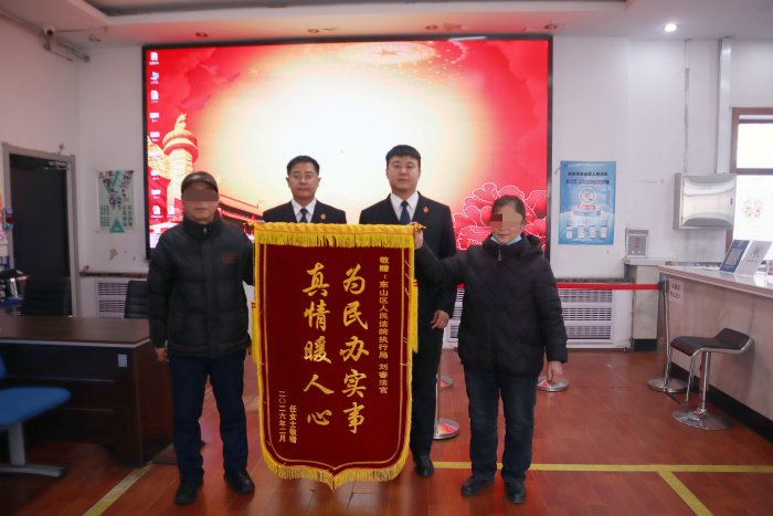 新春开工第一天,一对老人专程来到法院,将一面锦旗送到执行干警手中,感谢法院顺利执结其外孙女的抚养费案件。
